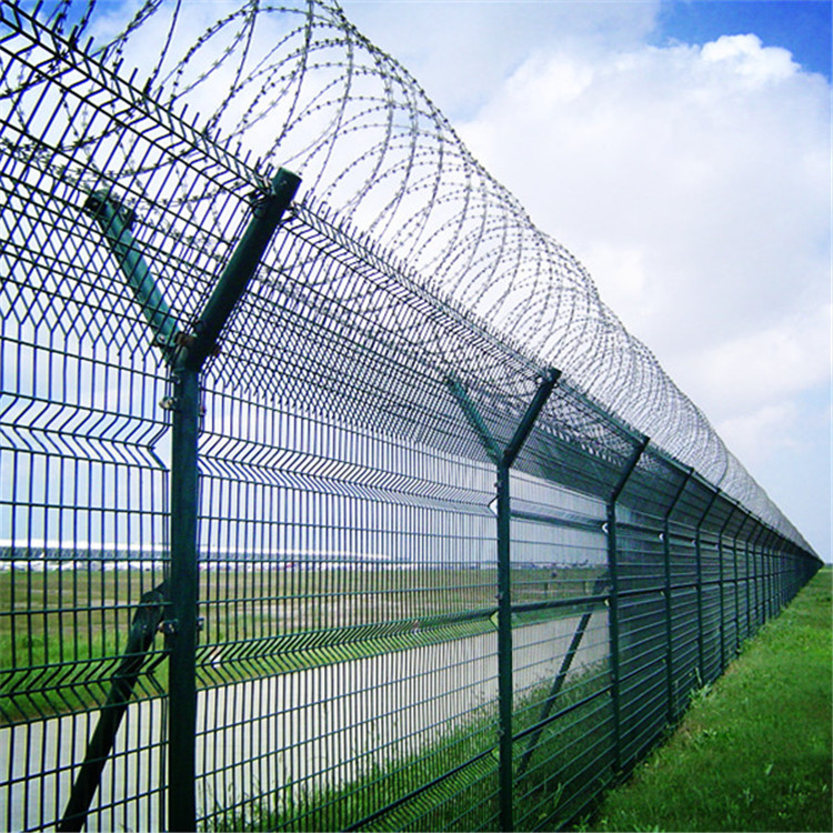 機場圍界頂部加裝刀片剌絲、刀片剌網后又很好的增強了安全防護性能。采用電鍍、熱鍍、噴塑、浸塑等防腐形式,具有很好的抗老化、抗曬、耐腐蝕等特點。產品造型美觀、花色多樣,既起到圍欄作用,又起到美化作用…