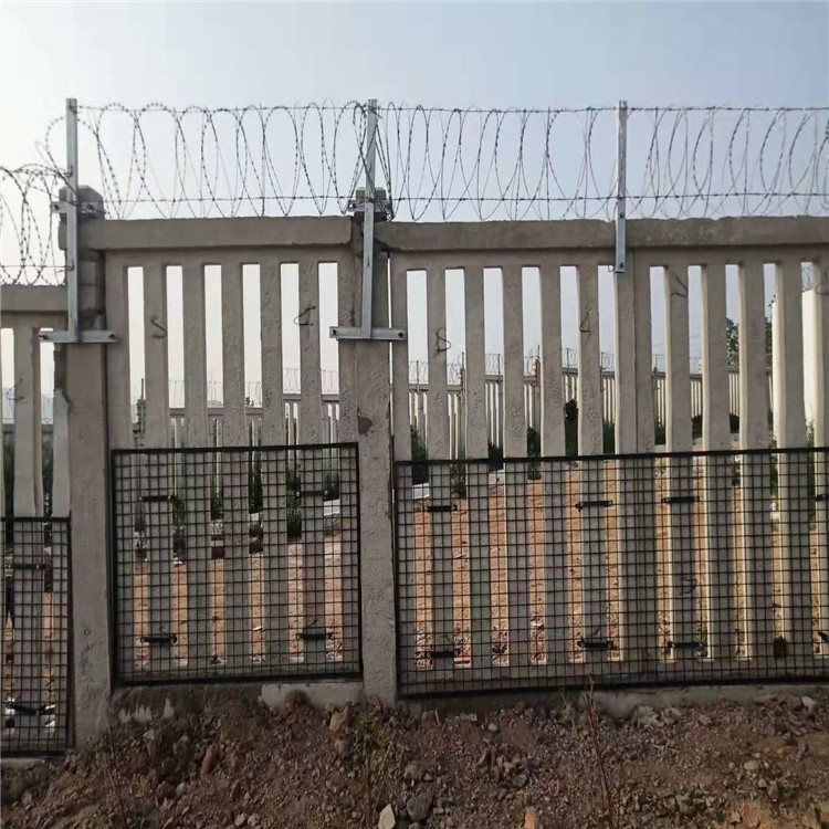高鐵刺絲滾籠安裝在鋼筋混凝土護欄的下邊緣與上邊緣之間的垂直間距為0.05m,其通過螺紋連接夾與縱向拉桿連接,該拉桿牢固地固定在支架上。鋼筋混凝土圍欄設有金屬絲籠,剃須刀桿,縱向拉桿,連接扣和支架。刀片由0.5 mm厚的Q195鋼板制成,支架放置在圍欄的柱子和中跨,跨越3米,其他只放置在柱子的上部。熱浸鍍鋅防腐處理和熱浸塑料的標稱包裝與混凝土柱上方的接頭一起進行包塑。