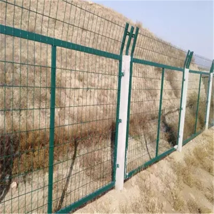 3、人口稀少地區設置型式當鐵路穿越山區、戈壁等常年沒有人、畜通行的地段,在這些地方設置鋼筋混凝土防護柵欄成較高,且利用率較低。本著經濟合理的原則,可以考慮在這些地區設置1. 8 m 高鋼筋混凝土立柱金屬網片防護柵欄
