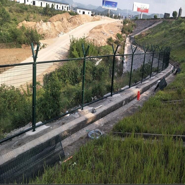 機(jī)場圍界隔離網(wǎng)又稱作“Y型安全防御護(hù)網(wǎng)”,是由V型支架立柱,加強(qiáng)型焊接片網(wǎng),安全防盜.連接件和熱鍍鋅刀片刺籠組成強(qiáng)度和安全防御性級別很高。近年來,被廣泛應(yīng)用在機(jī)場,軍事基地等高安全場所。在隔離網(wǎng)頂部加裝刀片刺絲、刀片刺繩后又很好的增強(qiáng)了防護(hù)性能。