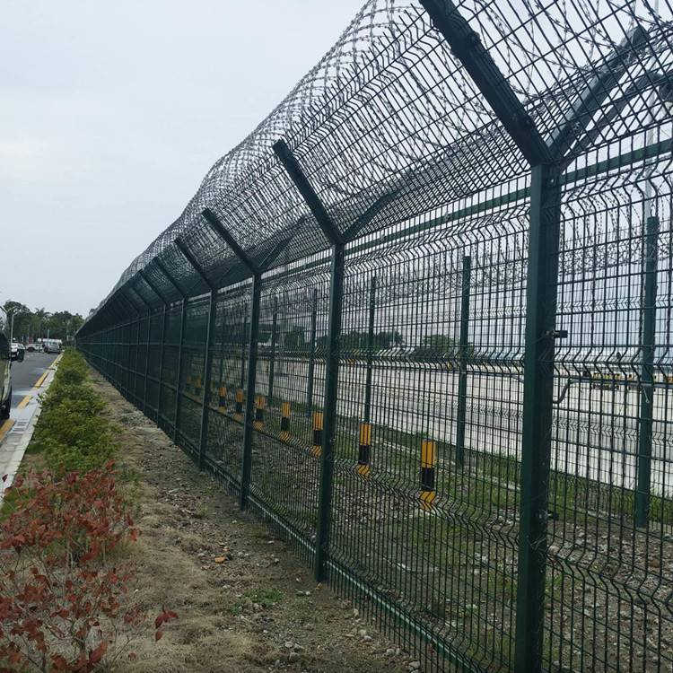 頂部帶有v字型支架用來安放刀刺滾籠。優點:相較于傳統鋼筋混凝土墻來說,具有成本低易安裝施工,施工周期短等特點。機場圍界網是用