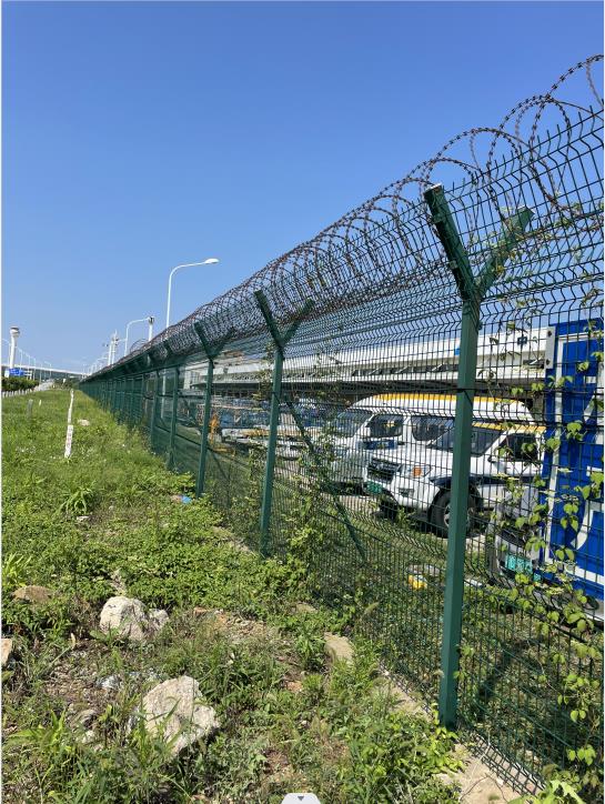 于機場周邊將機場與周邊農田設施相隔離的金屬圍界網,它是由立柱、網片、刺繩組成,一般表面采用浸塑或者噴塑處理用來防止腐蝕延長使用壽命。